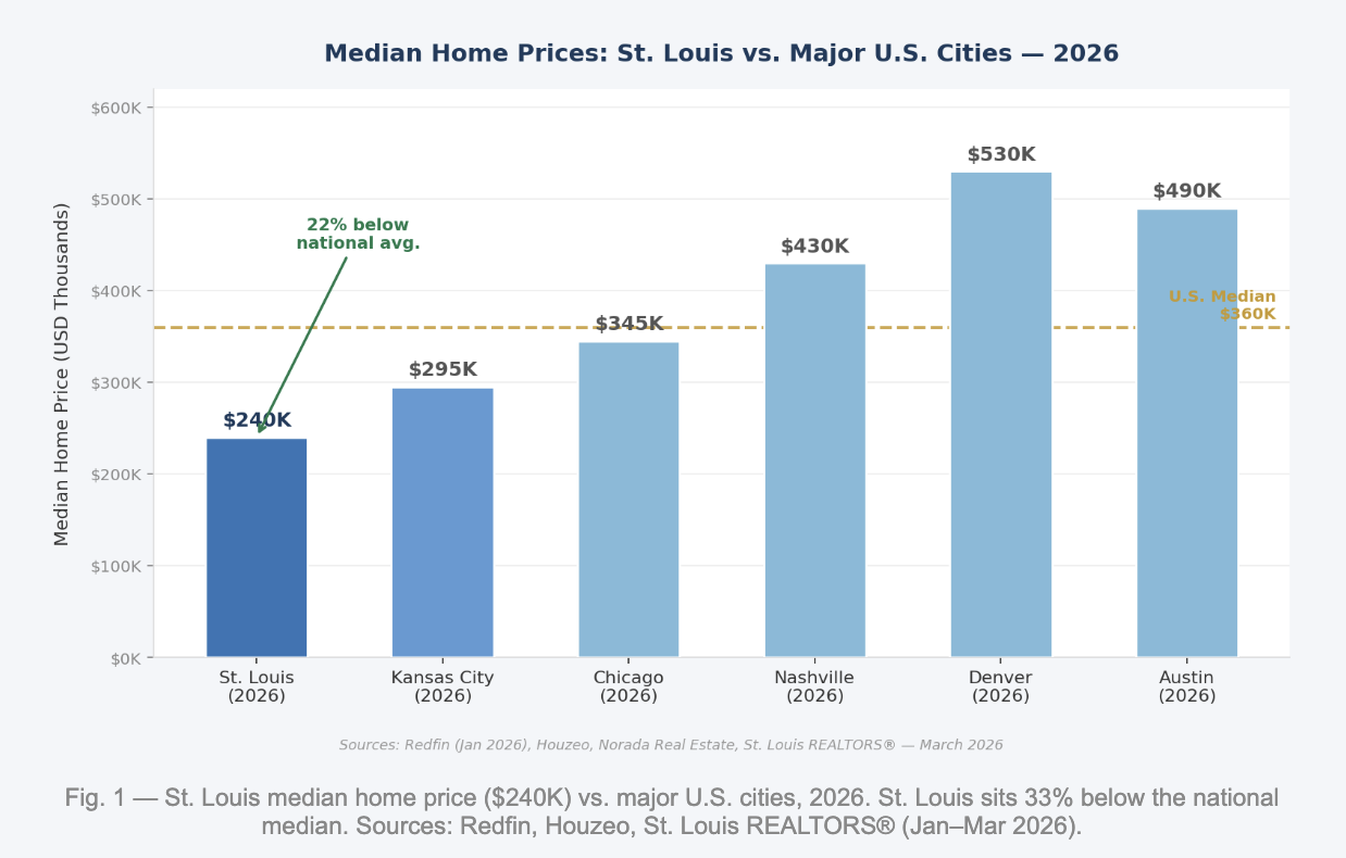 If you're a first-time homebuyer in St. Louis in 2026, you've picked your moment well. While real estate headlines across the country are dominated by stories of strained affordability, cooling demand, and buyer paralysis, St. Louis continues to defy the national trend. According to data published by St. Louis REALTORS in early 2026, the metro median home price stands at $240,000 — a figure that sits roughly 33% below the national median of $360,000. In a year when buyers in Nashville are staring down $430,000 price tags and Denver buyers are navigating a $530,000 average, that gap is staggering.