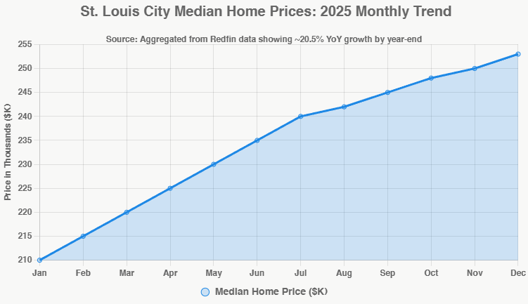 To visualize the year's momentum, here's a look at median home price trends in the St. Louis city proper throughout 2025 (approximate monthly medians based on aggregated data):